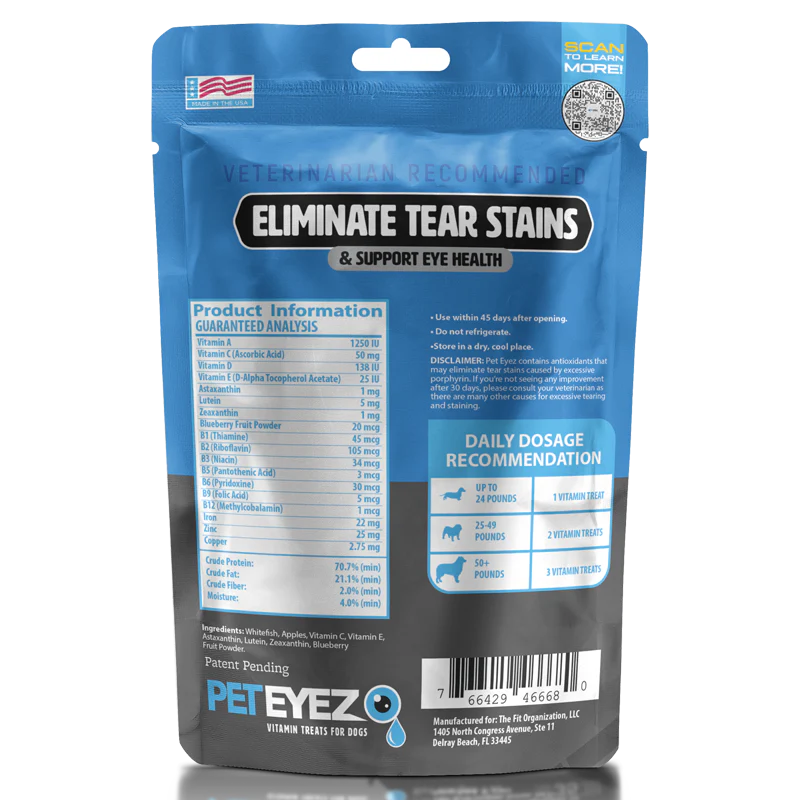 Pet Eyez™ 是一種天然的淚痕去除劑,旨在幫助防止寵物臉部淚痕的積聚。寵物可能會患有眼部疾病,如乾眼症和角膜潰瘍,可能需要使用 Pet Eyez™ 來緩解這些症狀。