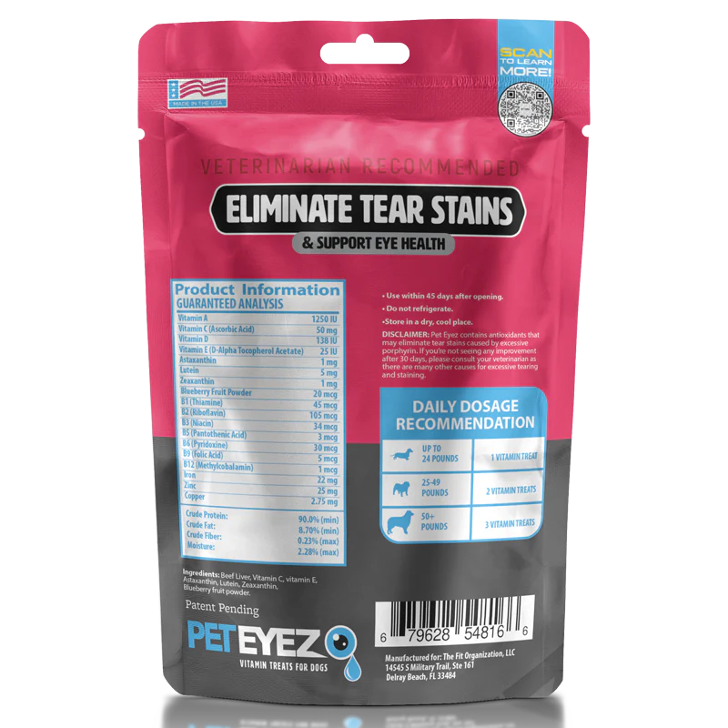 Pet Eyez™ 是一種天然的淚痕去除劑,旨在幫助防止寵物臉部淚痕的積聚。寵物可能會患有眼部疾病,如乾眼症和角膜潰瘍,可能需要使用 Pet Eyez™ 來緩解這些症狀。