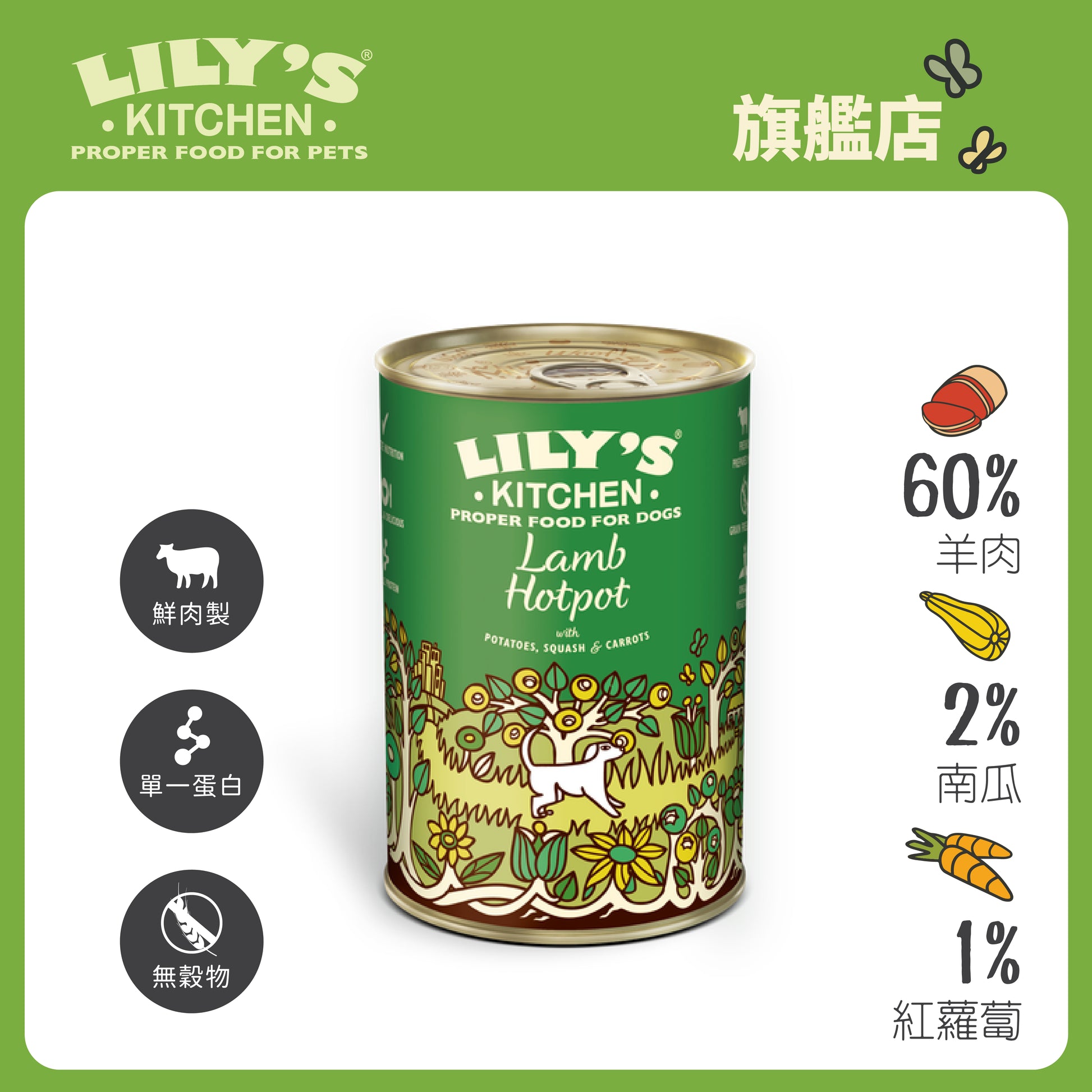 Lily's Kitchen 犬用主食罐系列,採用新鮮羊肉和農產品製成,包含狗狗真正健康飲食所需的所有必需維生素和礦物質,無添加糖、肉粉或動物衍生物及其他不必要和有害物質,讓狗狗享用到天然健康的膳食。