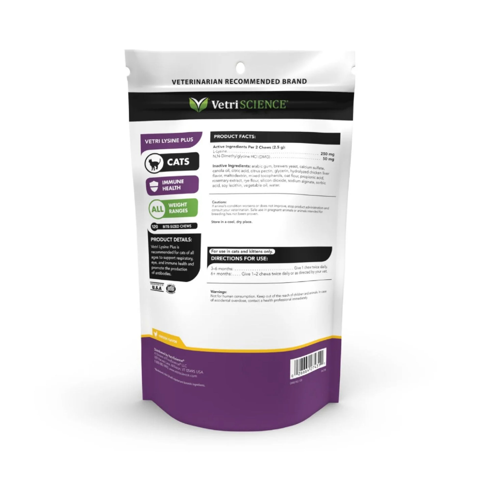 獸醫推薦的Vetri Lysine Plus 貓咪增強抵抗力肉粒是貓用 L-賴氨酸補充劑,採用賴氨酸和 DMG 的獨特組合配製而成,可支持強大的免疫系統和正常的呼吸系統健康和功能。賴氨酸的其他好處包括支持膠原蛋白的形成、組織修復和抗體的產生。